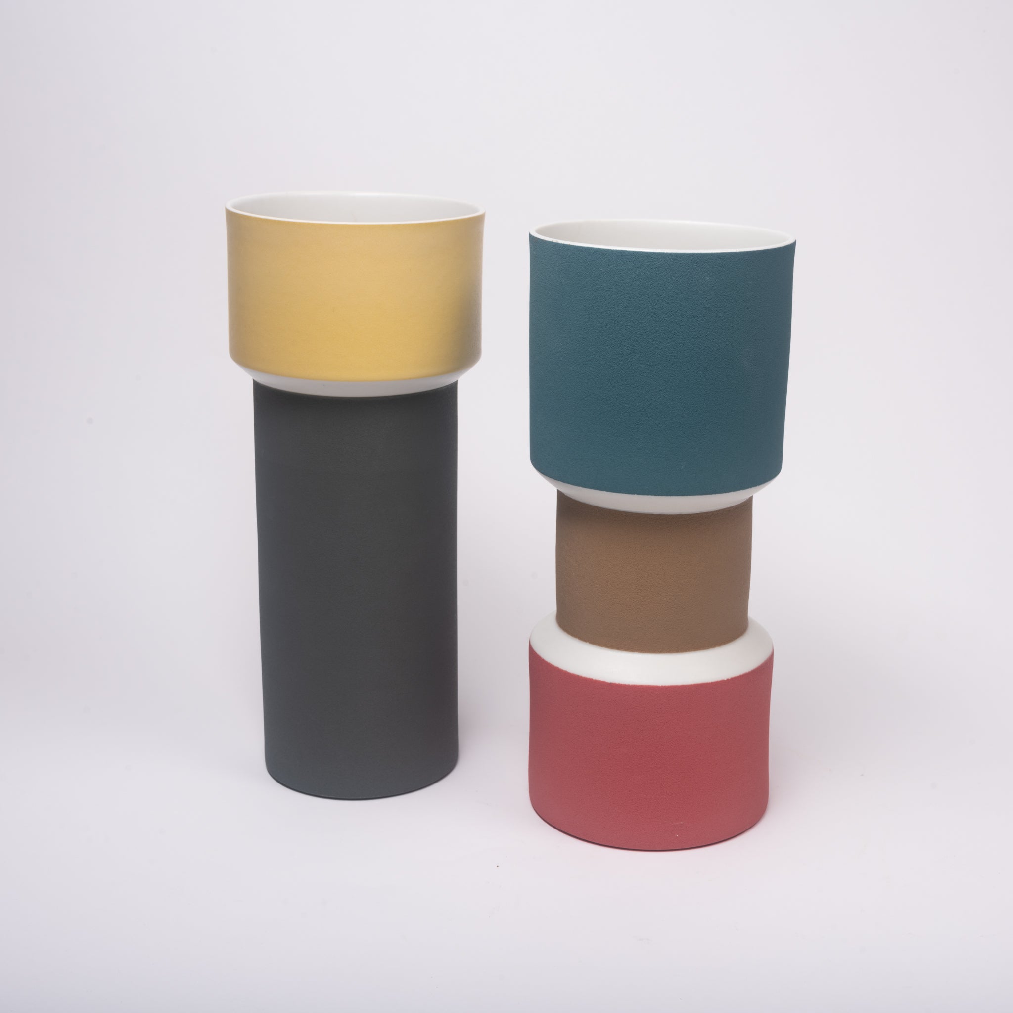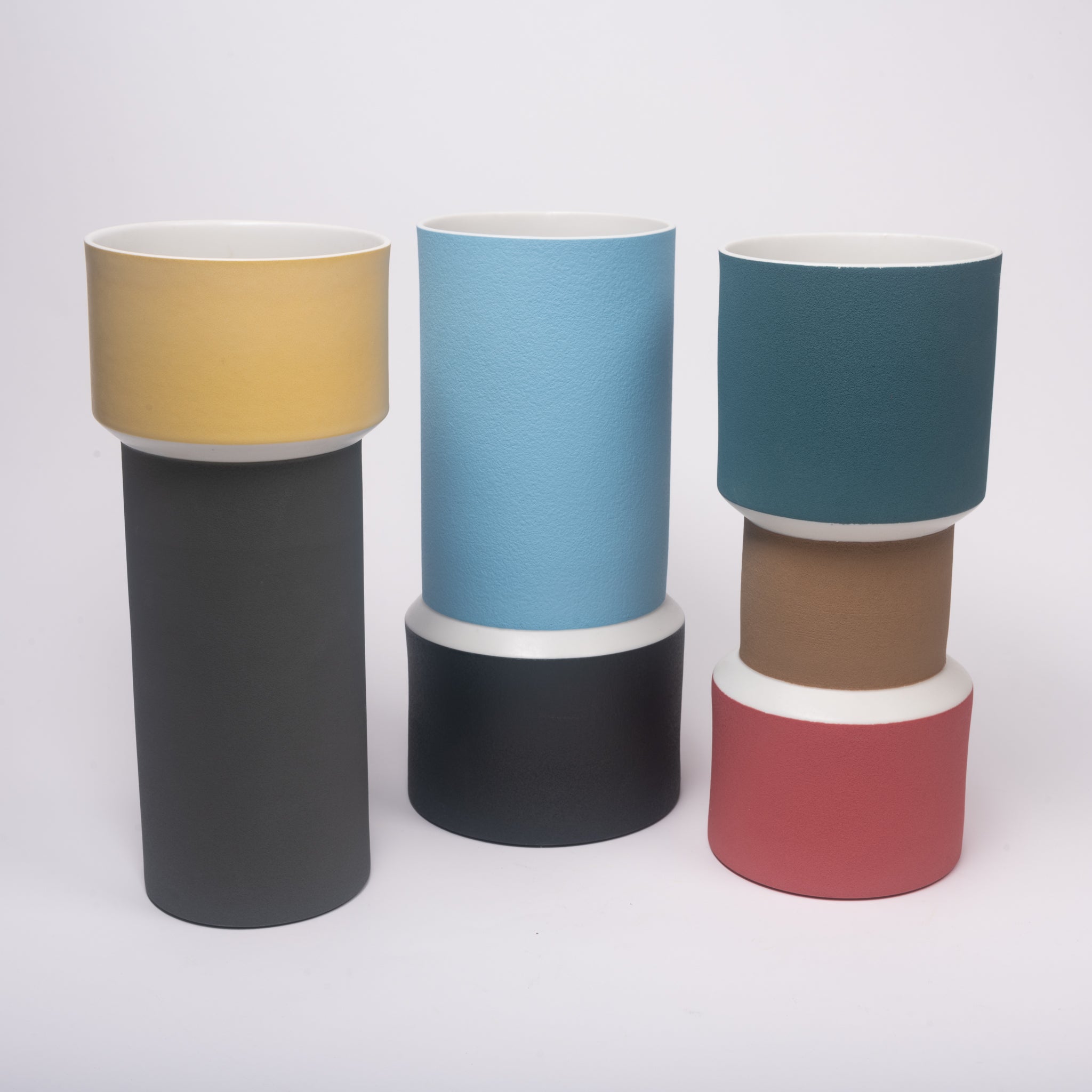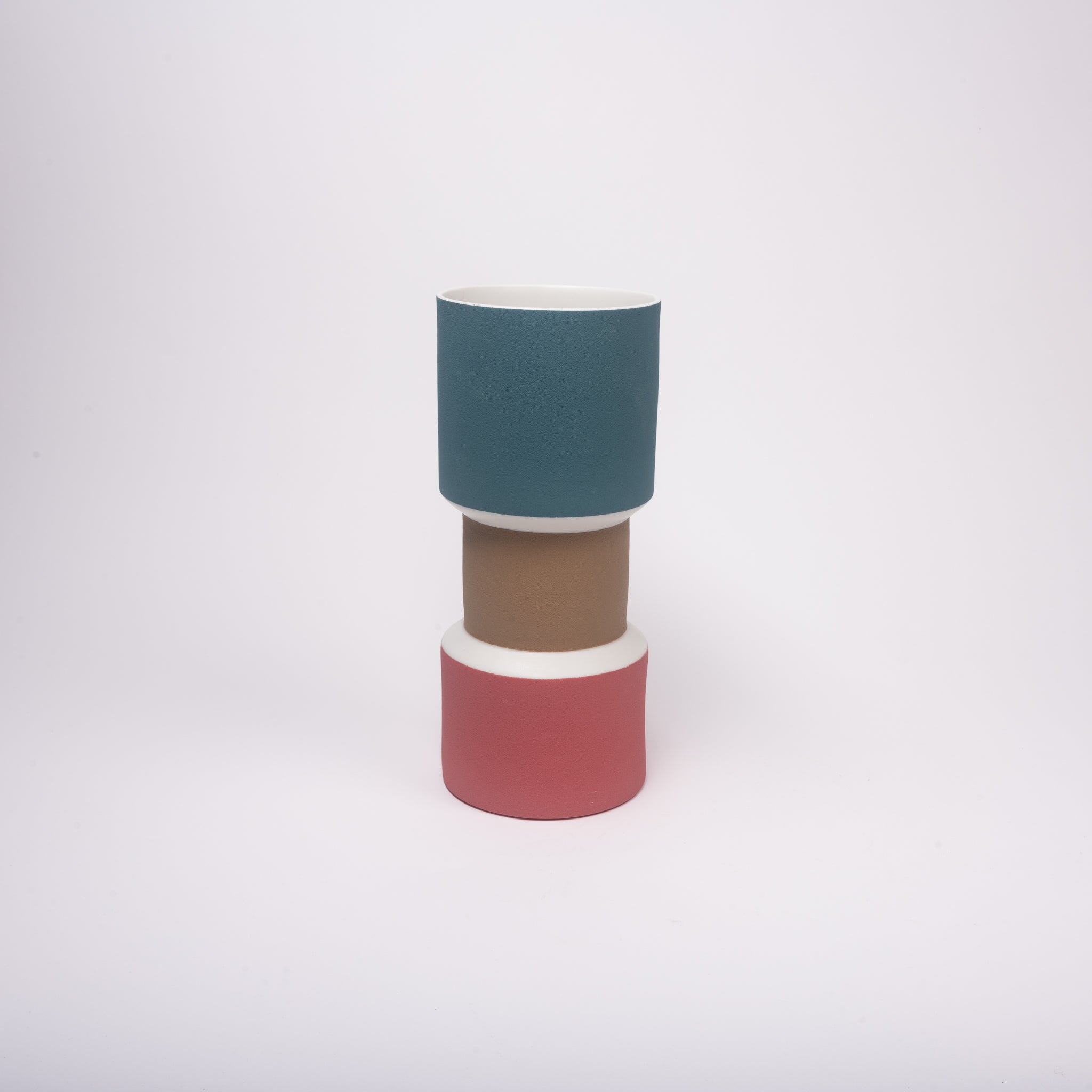 Zylinderförmige Vase aus Keramik, innen glasiert, aussen rauhe, matte Oberfläche, Farben: petrol, weiß, hellbraun, dunkelrot