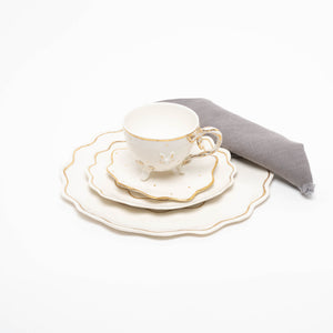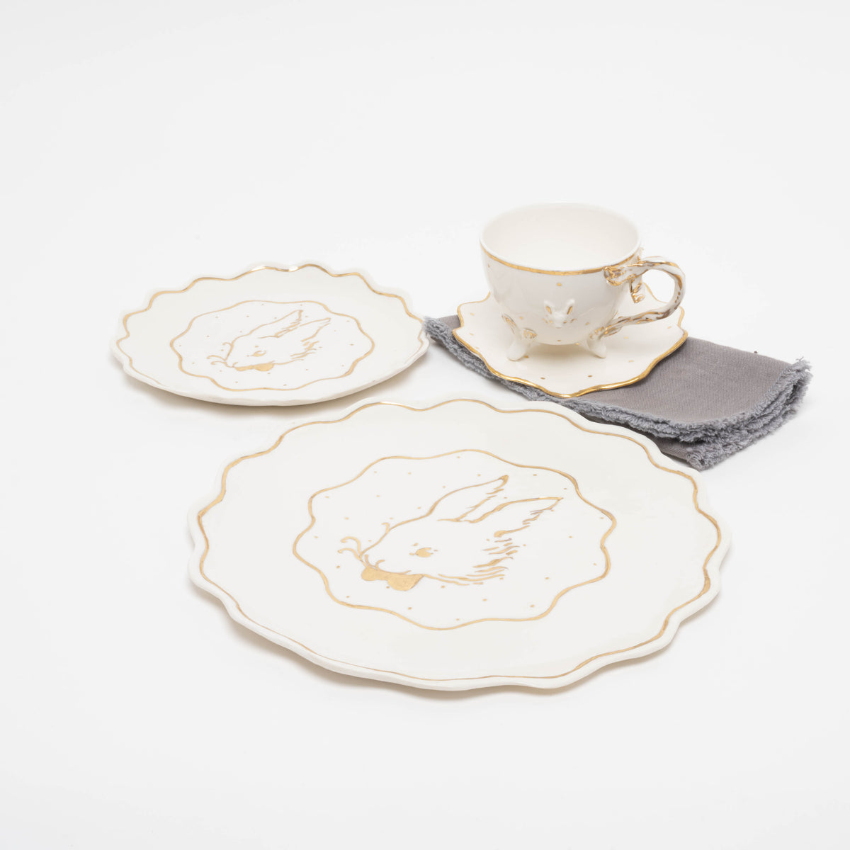Tortenteller aus Porzellan mit gewelltem Rand, 100% handgefertigt, weiß mit Golddekor "Hase" handbemalt. Passend dazu gibt es Dessertteller