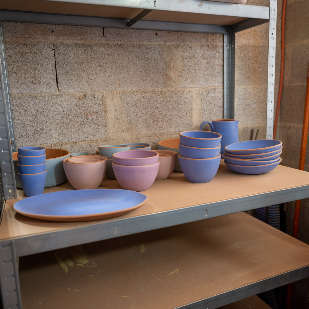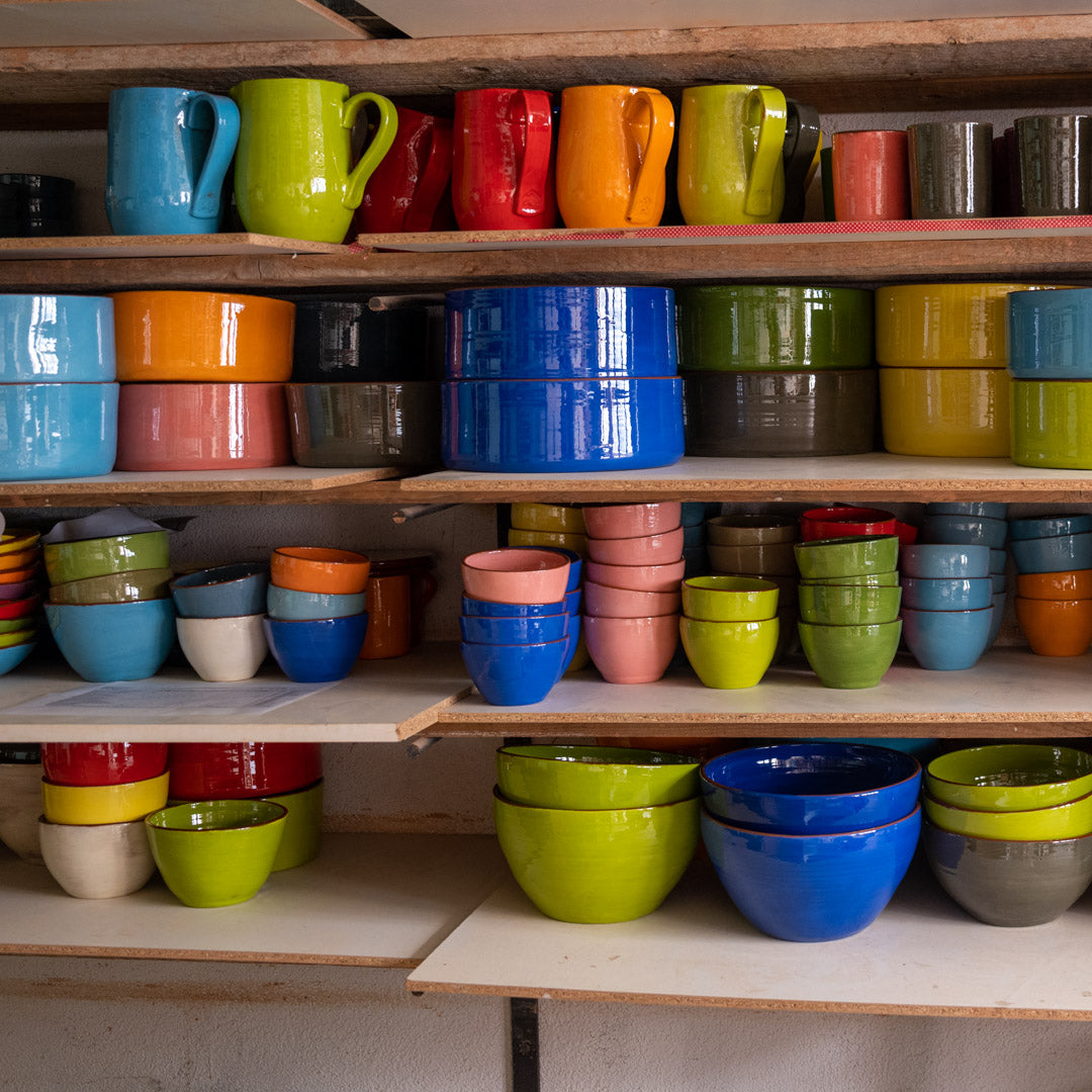 Jedes Teil ist handgedreht, mit bunten Farben engobiert und einer transparenten, glänzenden Glasur überzogen. Dabei scheint beim unregelmäßigen Rand der Teller, Schalen, Tassen, Platten und Schüsseln die Terrakotta-Farbe durch und umrahmt jedes einzelne Teil. Diese Besonderheit wird zum verbindenden Element der Keramiken von Nicolas und erinnert an die Erde und die Arbeit des Handwerkers.